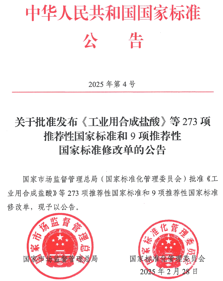 | 1 | GB/T 320-2025 | 工业用合成盐酸 | 2025/9/1 |
